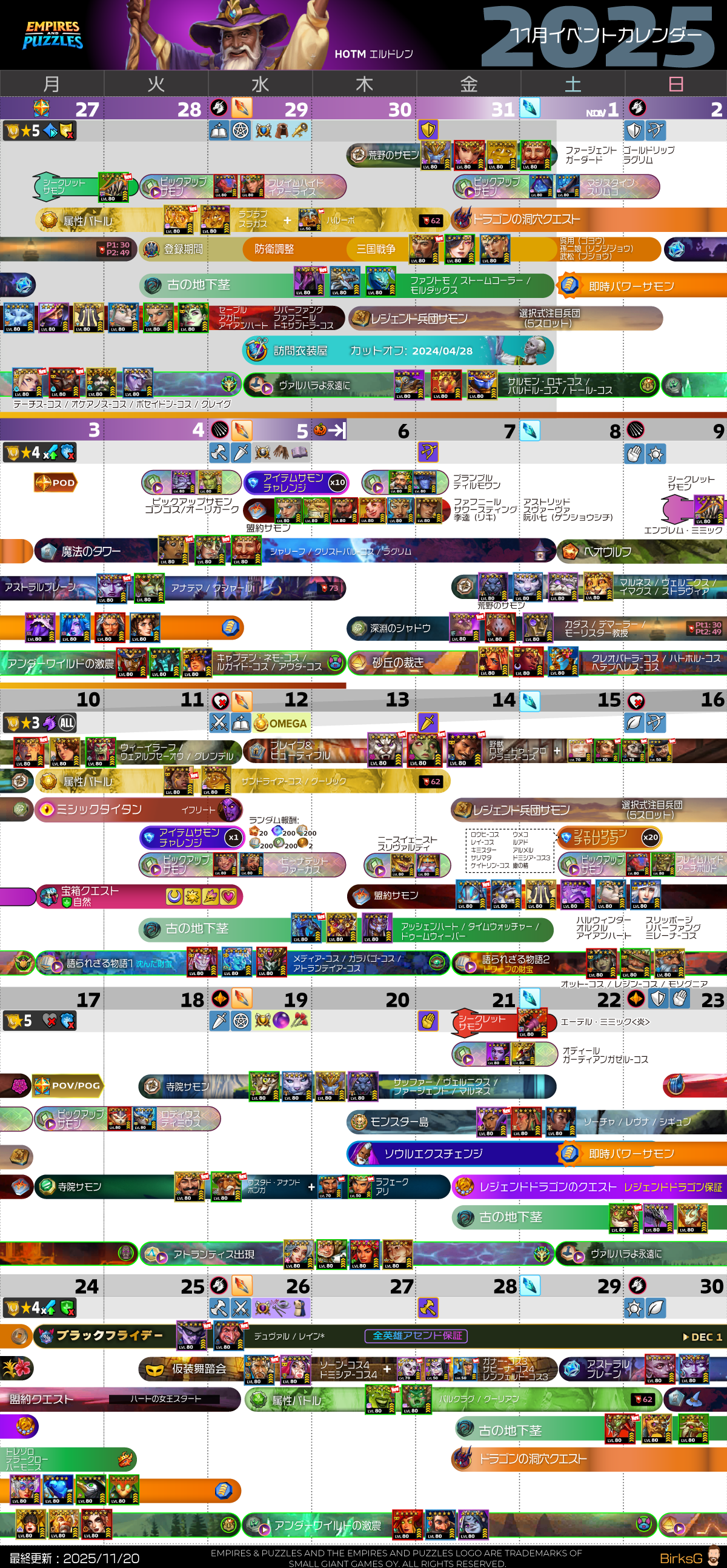 • 📌11月の目玉としては毎年開催される「**ブラックフライデーサモン**」。今年はサモンで入手するすべての英雄(ボーナスドローの月間英雄を除く)が育成された状態になります。最大LB2までが確率で決まるのは、エンブレムは付かないなど内容がやや異なりますが、即時パワーサモンに感覚に近いです。シーズン1の★4★3は完全排除。