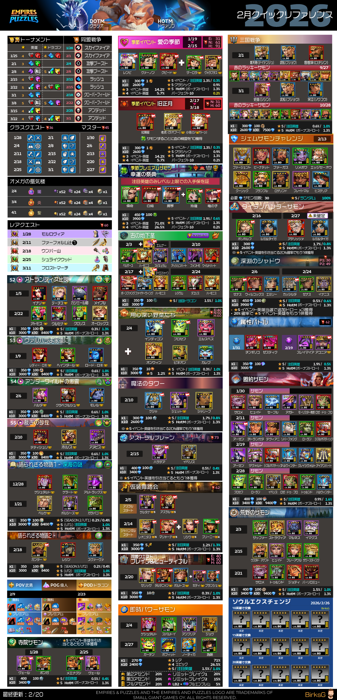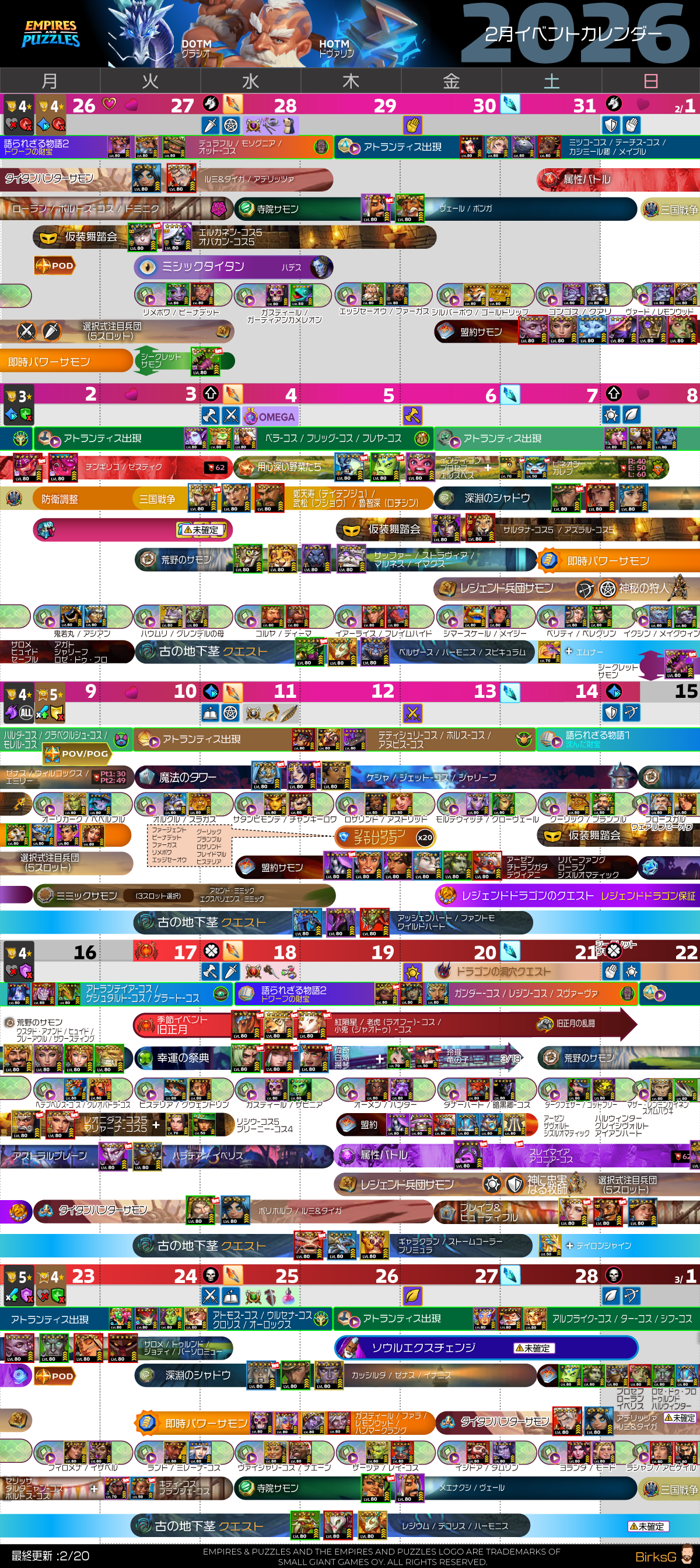 📌その他、いつも通りのクエスト、未定のものも多いです。また、今月からスタート予定のレジェンド兵団サモン併設のクエストが入る予定ですが、まだスケジュールには入っていません。
