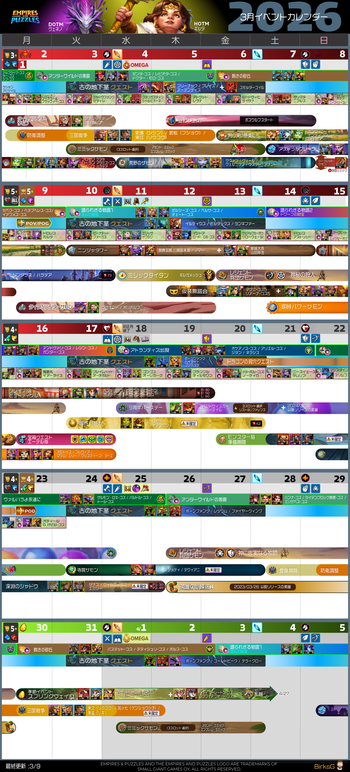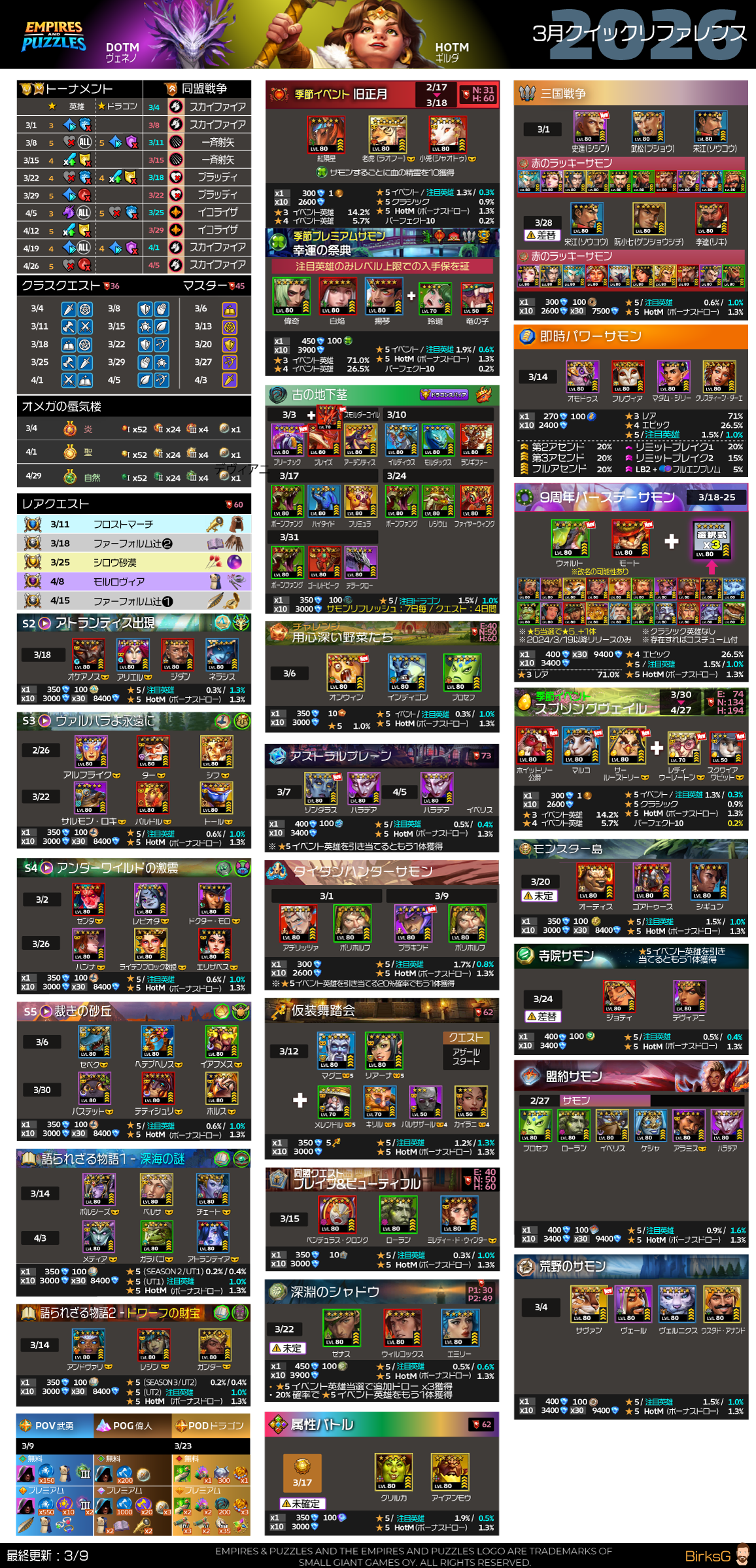 📌9周年バースデーサモンは従来どおりですが、今回の先行ファミリーは「げっ歯類ファミリー (Adventurous Rodent)」もうちょいいい名称なかったのかな 開催日から2年以内リリースの英雄でクラシック英雄なしとなっています。