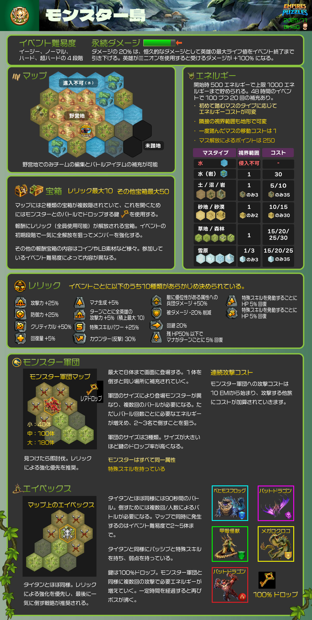 移動したり、敵を攻撃するとモンスター島エネルギーを消費する。同じ敵を攻撃するごとに、エネルギーコストも増加する。エネルギーは一定時間が経過するとフル回復する。