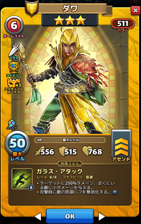 ![]() ![]() コスチュームを持てない英雄の場合は「選択不可」となり選べません。 英雄の身元によってマナボーナスが異なりますが自動的にボーナス値を算出します。 コスチュームボーナス |